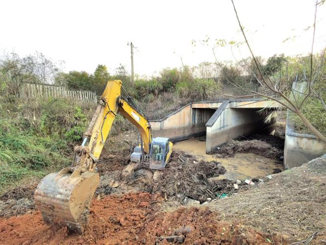 在龍溪橋灌區(qū)的渠道旁,挖掘機(jī)鐵臂揮舞,將淤積的泥土和雜物連根挖起;運(yùn)輸車輛來回穿梭,把清理出的淤泥及時轉(zhuǎn)運(yùn);身著迷彩服或工裝的工作人員手持鋤頭、鐵鍬、鐮刀,在渠道內(nèi)外坡?lián)]汗如雨——有的砍除叢生的灌木雜草,有的疏浚堵塞的涵洞,有的平整渠道邊坡。從長渠到涵洞,從機(jī)械轟鳴到人工協(xié)作,處處呈現(xiàn)出干群同心、攻堅(jiān)克難的生動場景。管理所全員上陣,分工明確,協(xié)同高效,確保每一段渠道都清理到位。