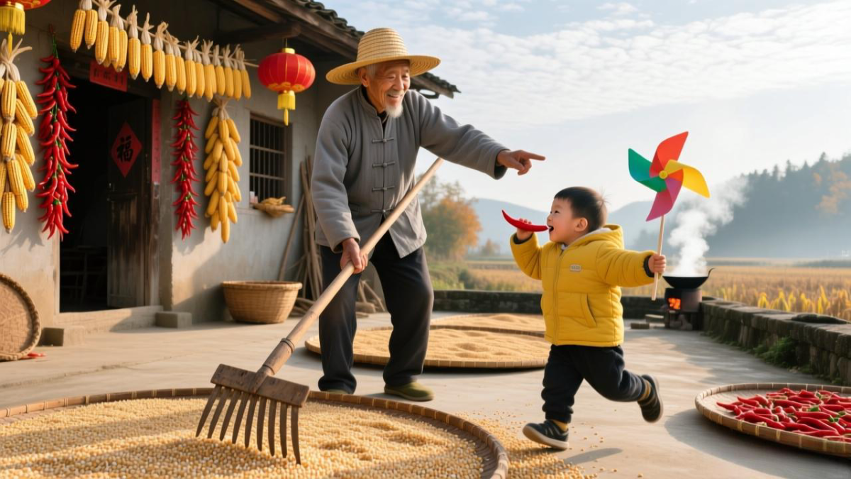 日頭偏西時,村外田埂上多了兩道牽著手的身影。張大爺牽著孫子慢慢走,彎腰拾著殘留的稻茬,孩子的小手捏著片沾霜的稻葉,霜粒在掌心化了,涼得他縮了縮指尖,卻仍舍不得丟。“爺爺,霜是冬天寄來的信嗎?”孩子仰頭問,眼里滿是好奇。大爺笑著把孫子的棉衣裹緊些,指了指遠(yuǎn)處的耒水:“是啊,霜落了,河水就靜了,等開春又會熱鬧起來。”他從口袋里摸出幾顆南瓜子,還帶著爐臺的余溫,是王阿婆剛炒好的。順著大爺?shù)哪抗馔?,曬谷場的稻穗堆泛著暖黃,霜粒在谷尖折射出柔和的光,正應(yīng)了“樟葉凝霜秋意盡,村前曬谷起金光”的景致。